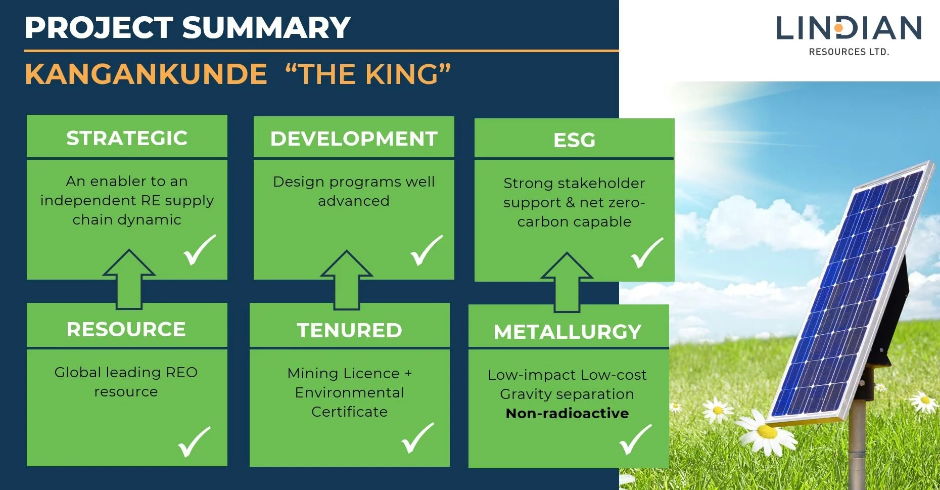 On 4 August 2022, Lindian Resources Ltd announced it had entered into an agreement to acquire 100% of the Kangankunde Rare Earths Project in Malawi. Kangankunde Rare Earths Project is a globally significant rare earth resource in potential for size, grade and quality. Hosting a carbonite intrusive with outstanding grades of up to 23.7% TREO that importantly contains very low thorium. Simple metallurgy. Tenured mining licence; close to logistical infrastructure.